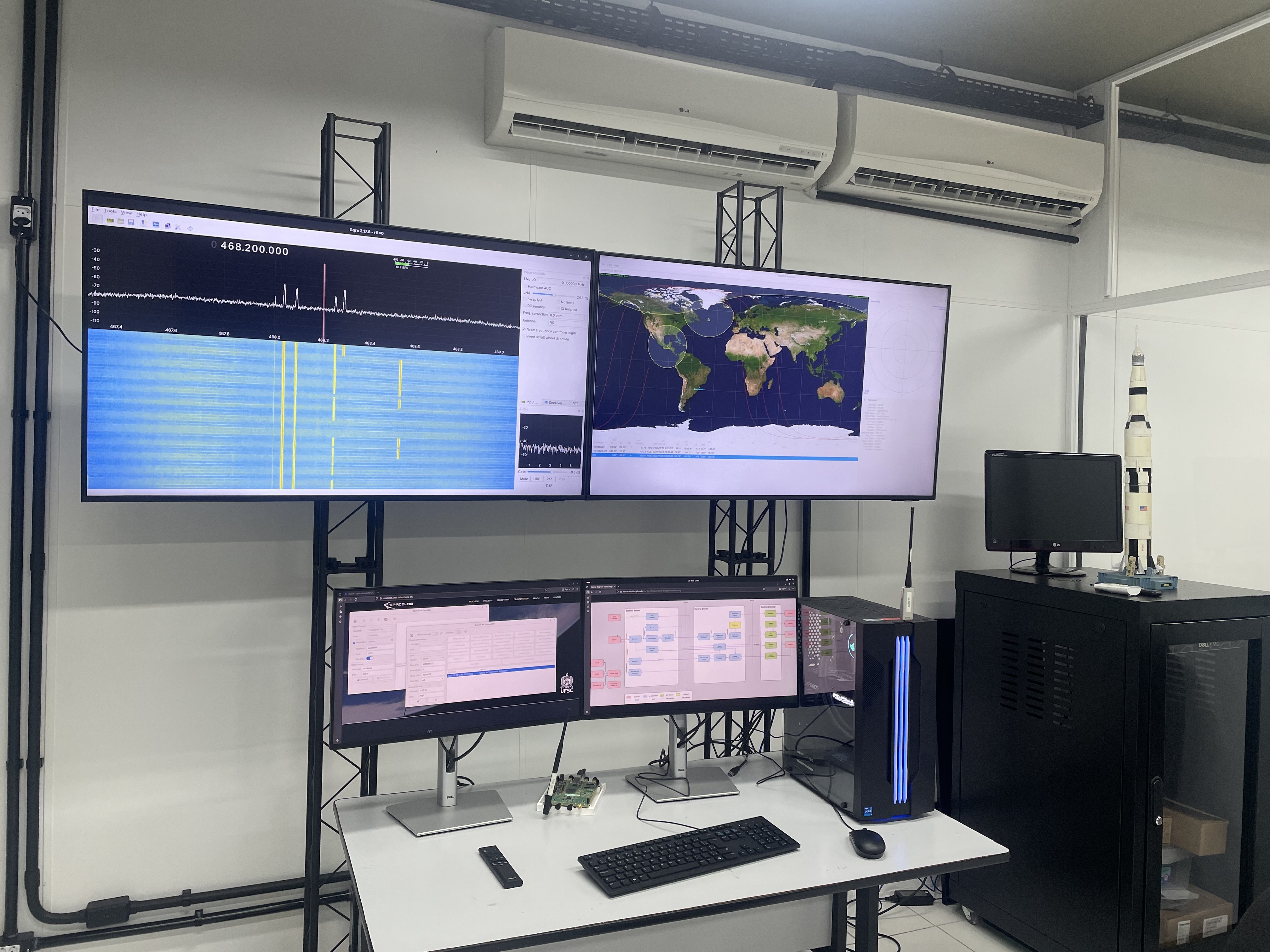 The control room features an array of high-resolution displays that present essential mission information. The upper-left screen shows a real-time radio-frequency spectrum and waterfall plot, enabling operators to monitor downlink signals, identify transmission events, and assess the overall quality of the communication link. The upper-right display provides a global map with satellite ground tracks, orbital parameters, and visibility predictions, allowing precise planning and execution of communication passes.